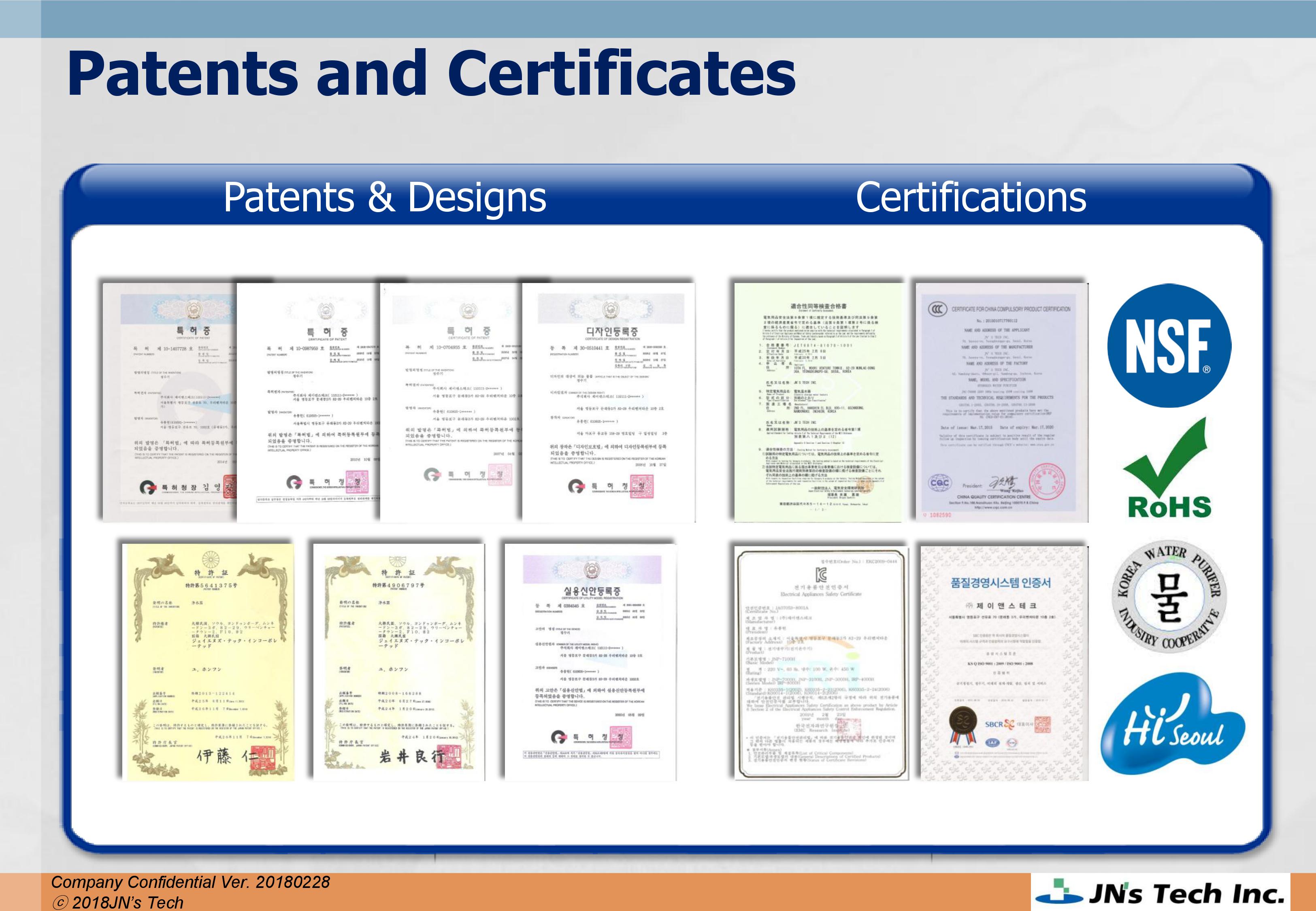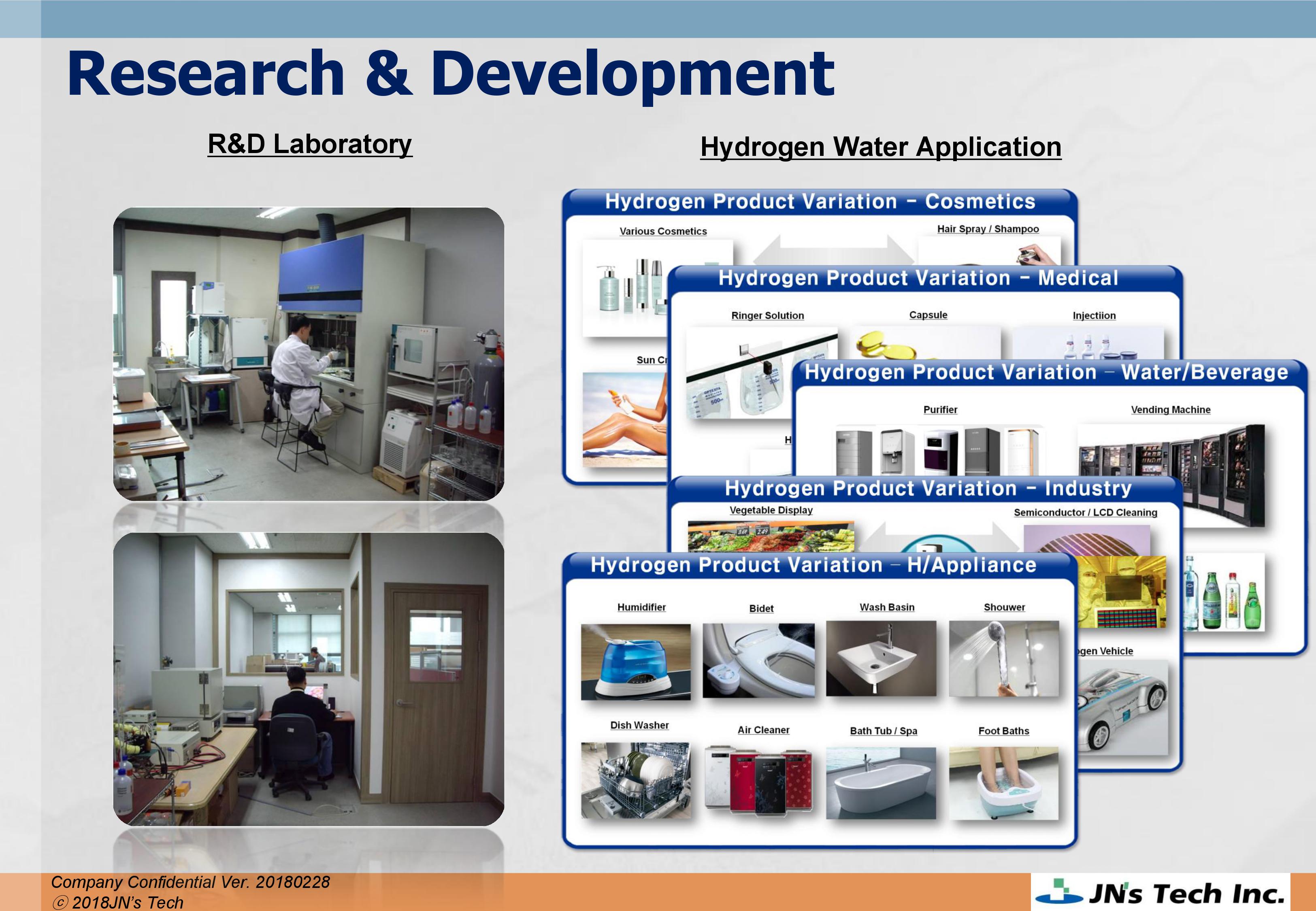 Since its inception, JN's Tech has designated water, air, and light as our business scope and has been developing living and home appliances that are essential to ourhealth and eco-friendly lives. We are specialists in environmentally friendly living and health. Our company has reaped continuous success backed by customer support. We have acquired patents for hydrogen water technologies to remove free-radicals, developed hydrogen water purifiers, strengthened our lineup for living and environmental appliances such as high quality bidets and personal oxygen generators, and developed and sold Luxzen interior lighting. Now, together with our customers, JN’s Tech is beginning to take the second leap forward, building upon the achievements we have made so far. We established a R&D center, the H&O Science Forum, in 2006 to expand our eco-friendly business and to reinvent our designs. We do our best to reach out to our customers through diversifying our sales channels. In 2012, we started exporting the world’s best second generation hydrogen water purifier to Japan. We entered to the Chineae market from 2015 and completed test marketing to enter the U.S.A market. We strive to become a global well-being company through diversification of market/partners. In addition, we have renewed our vision as a “Specialized hydrogen water provider” that provides the world’s best hydrogen water.