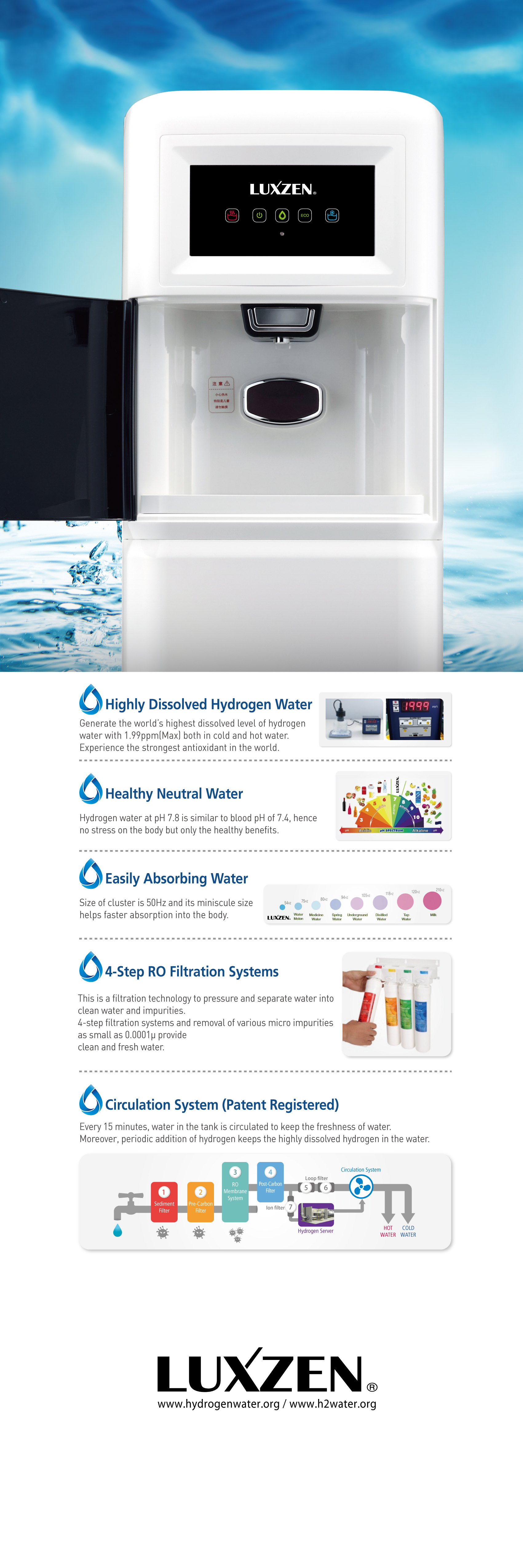 1) JN's Hydrogen Rich Water Purifier is providing healthy (Hot/Cold)water that contains world top level of the dissolved hydrogen with 1.99ppm or more.